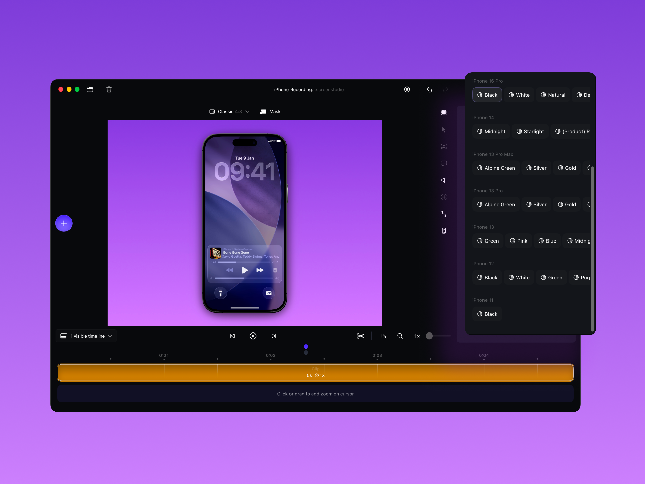 - 由于隐私限制,Screen Studio 无法像录制桌面鼠标点击和移动那样录制您的手指触碰操作,因此不支持自动缩放。