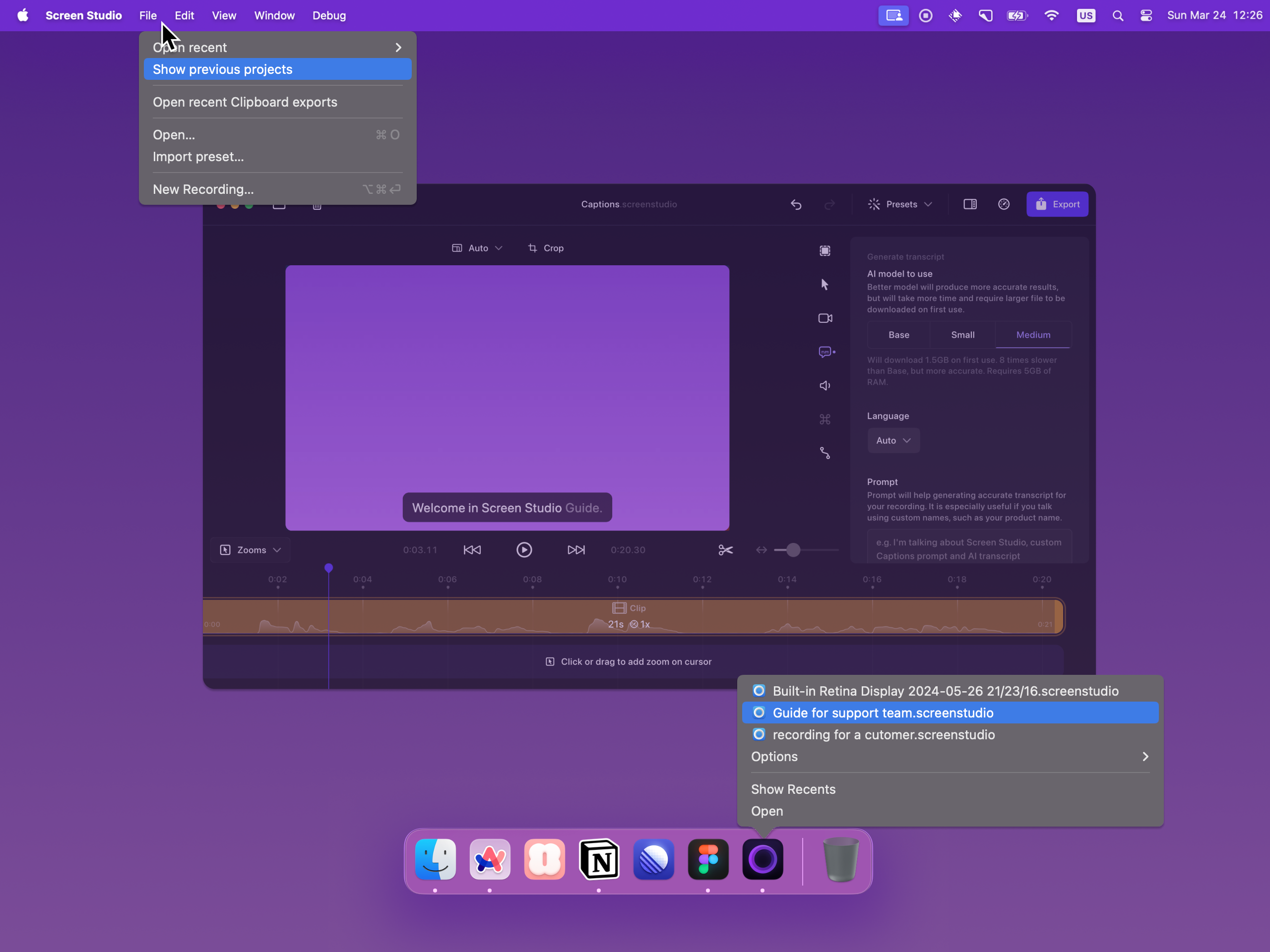 Open recent 会显示最近创建或编辑的项目列表。您也可以右键点击 Dock 中的 Screen Studio 应用图标来查看最近的项目。