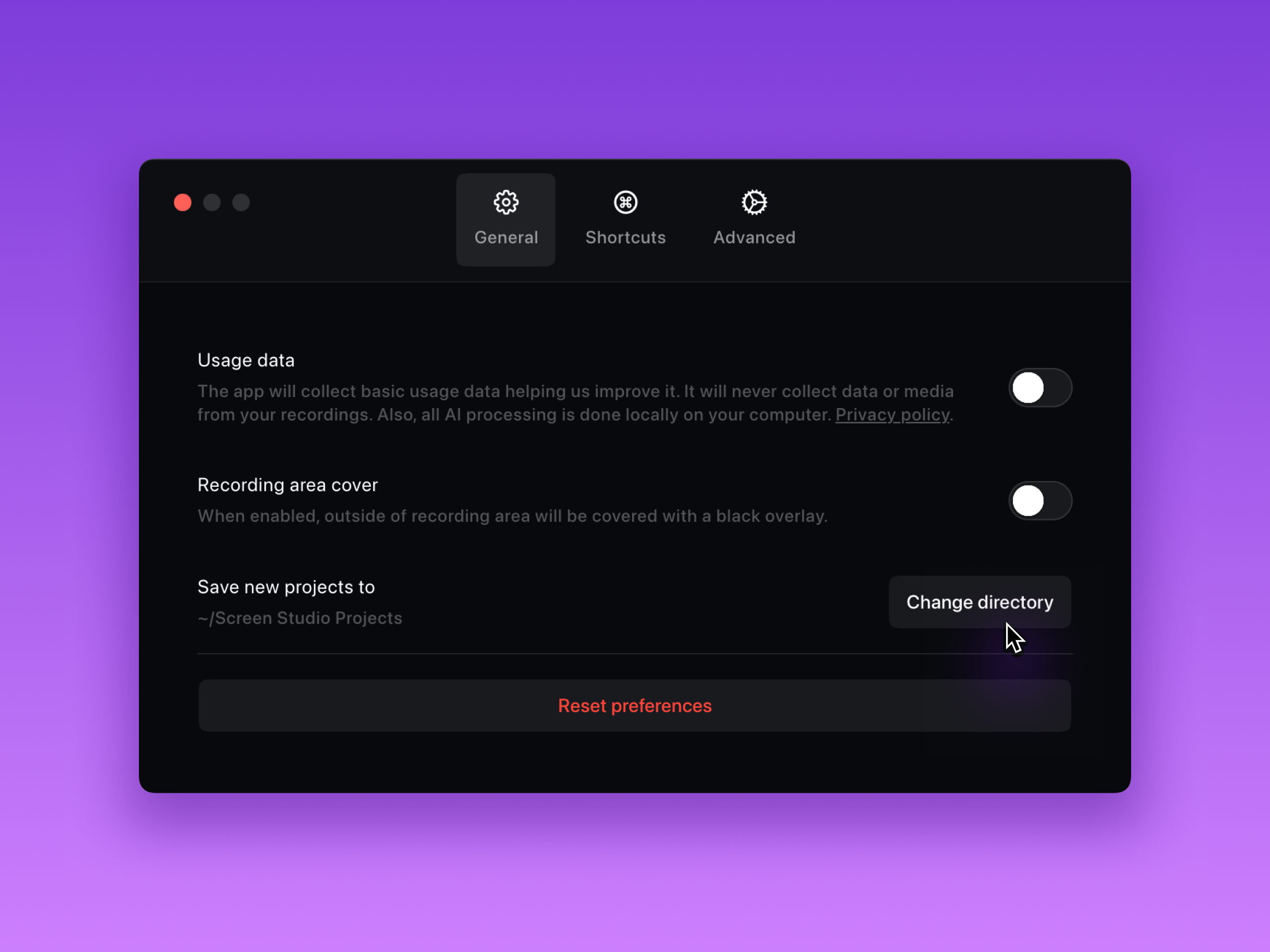 操作方法:在顶部菜单栏中选择 Screen Studio,然后选择 Settings(设置),或直接使用快捷键 ⌘ + , 打开设置。