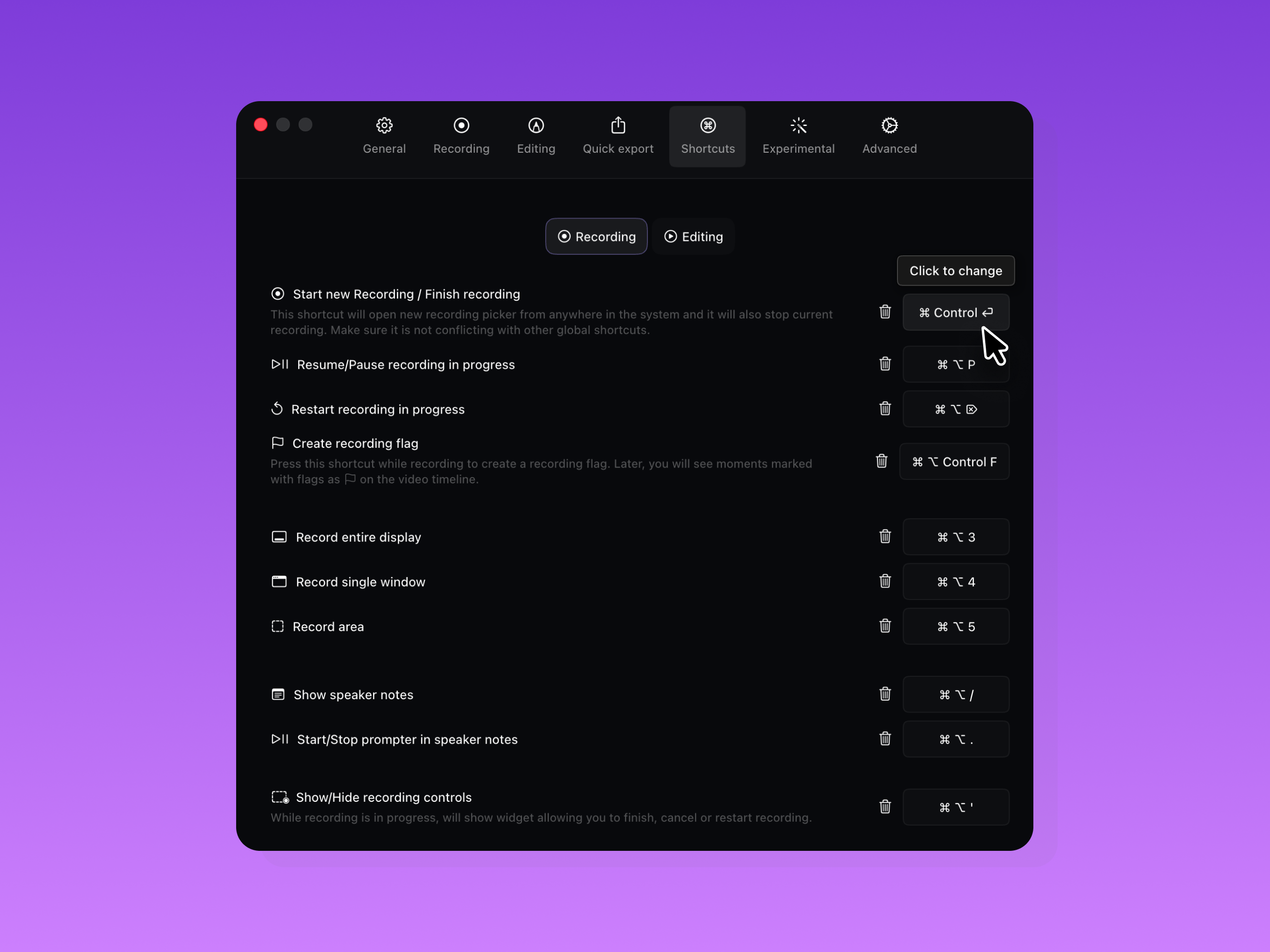 Screen Studio 支持自定义快捷键来触发应用内的各种操作。